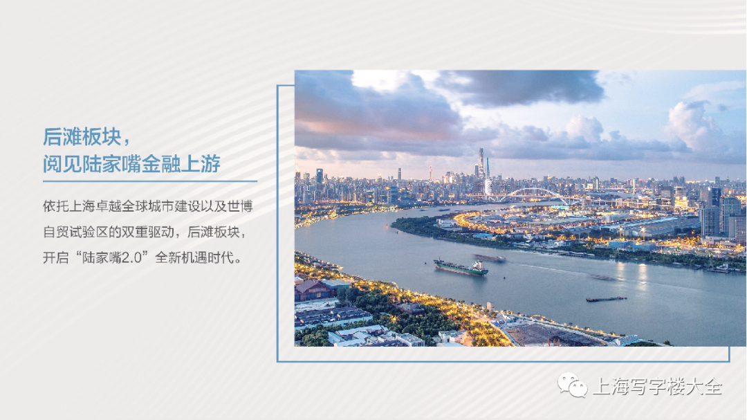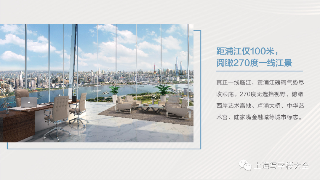 后难滨江一线,上海新兴金融商务坐标纵享270度无遮挡视野,是江纳百川,亦是洞见世界于此,阅读浦江,阅读世界,真正一线临江,黄浦江磅磺气势尽收眼底。270度无遮挡视野,俯瞰西岸艺术高地、卢浦大桥、中华艺术宫、陆家嘴金融城等城市标志